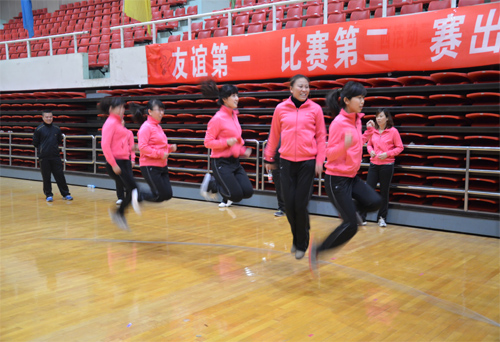 8人的集体跳绳比赛对运动员的耐力和齐整度是一个不小的考验,我公司参加运动员完成了49次的有效好成绩!