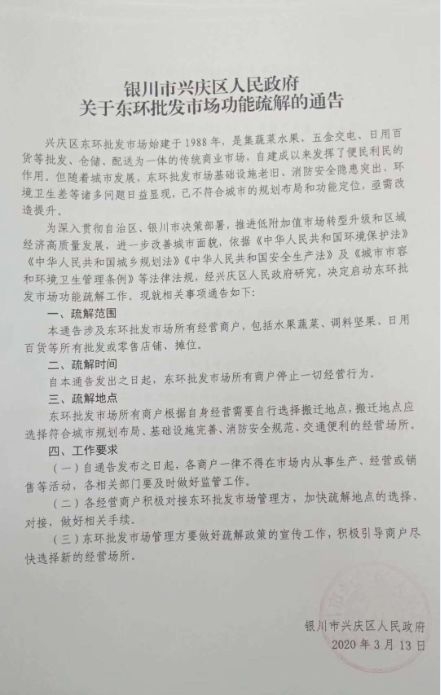 新闻中心3月13日,兴庆区人民政府正式发布了《银川市兴庆区人民政府关于东环批发市场功能疏解的通告》。通告肯定东环市场的历史功用,同时指出现阶段,东环市场已经不能满足城市规划布局及功能定位的发展需要,并就东环市场的的功能疏解事宜给出了具体指导及工作要求,东环动迁已成定局。
