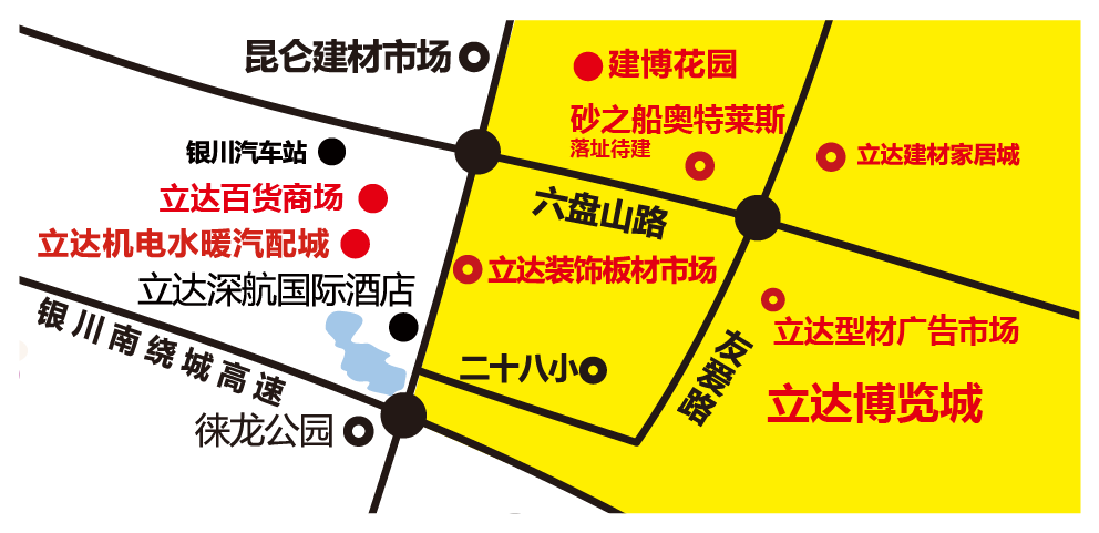 立达博览城68#地,南至规划路,北至六盘山路,东至燕庆路,西接交通物流要道友爱路,畅通四方,收发货方便,高效配送全国,同时市场内自配物流,立达型材广告市场百米内配套大型物流园,百条线路畅达全国,有效降低商户运输成本,提高配送效率,物流高效便捷。