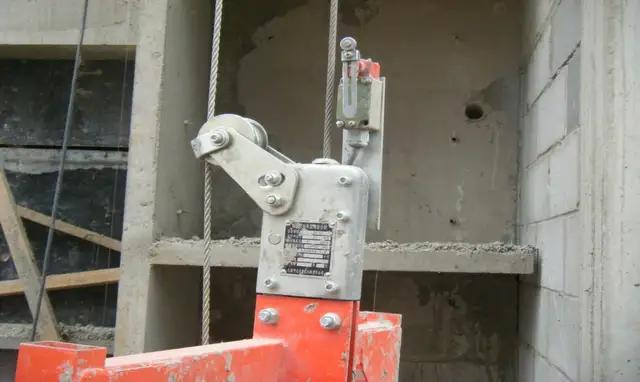 3)悬挂机构:前支架应与支撑面垂直,且脚轮不应受力;上支架应固定在前支架调节杆与悬挑梁连接的节点处;严禁使用破损的配重块或其它替代物,悬挂机构前支架不得支撑在女儿墙及建筑物外挑檐边缘非承重结构上。